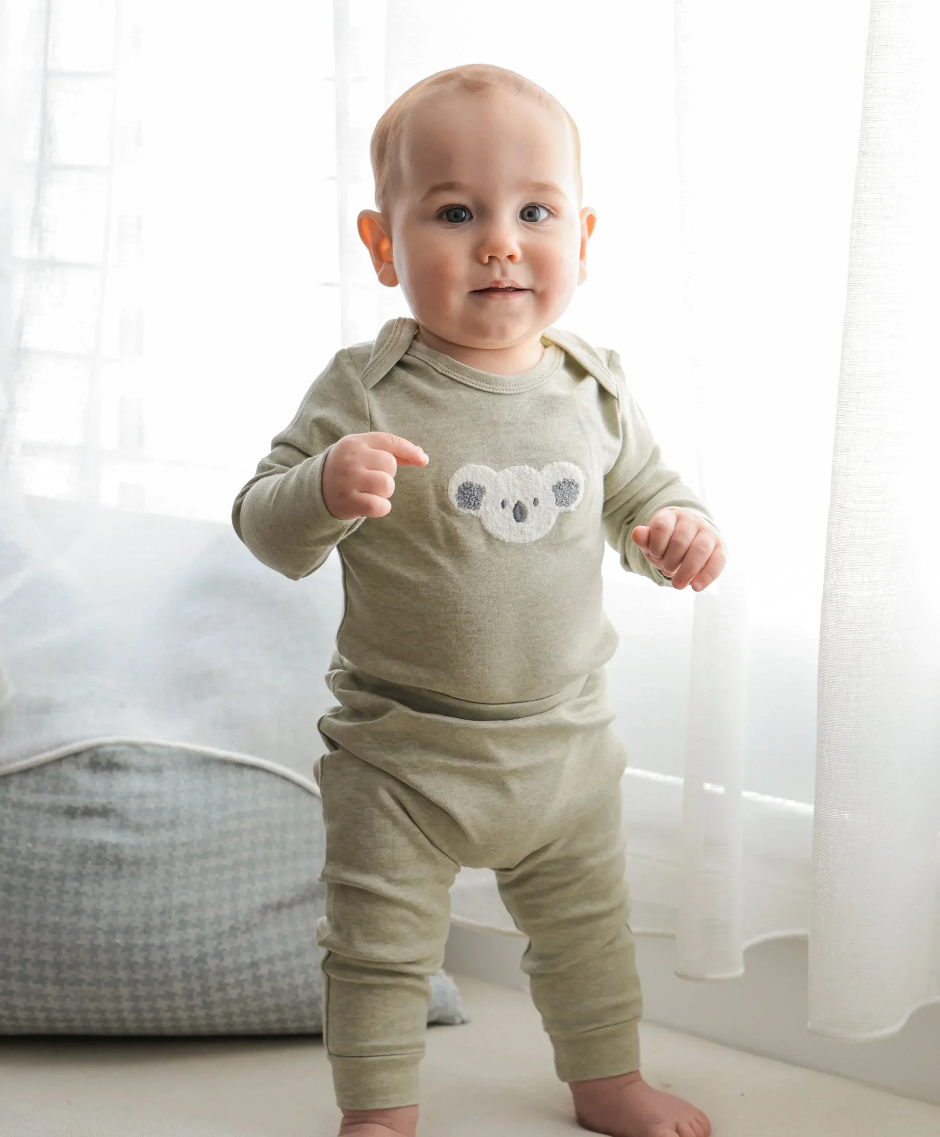 The chenille koala bear finish is featured on our signature sage greenorganic cotton fabric.